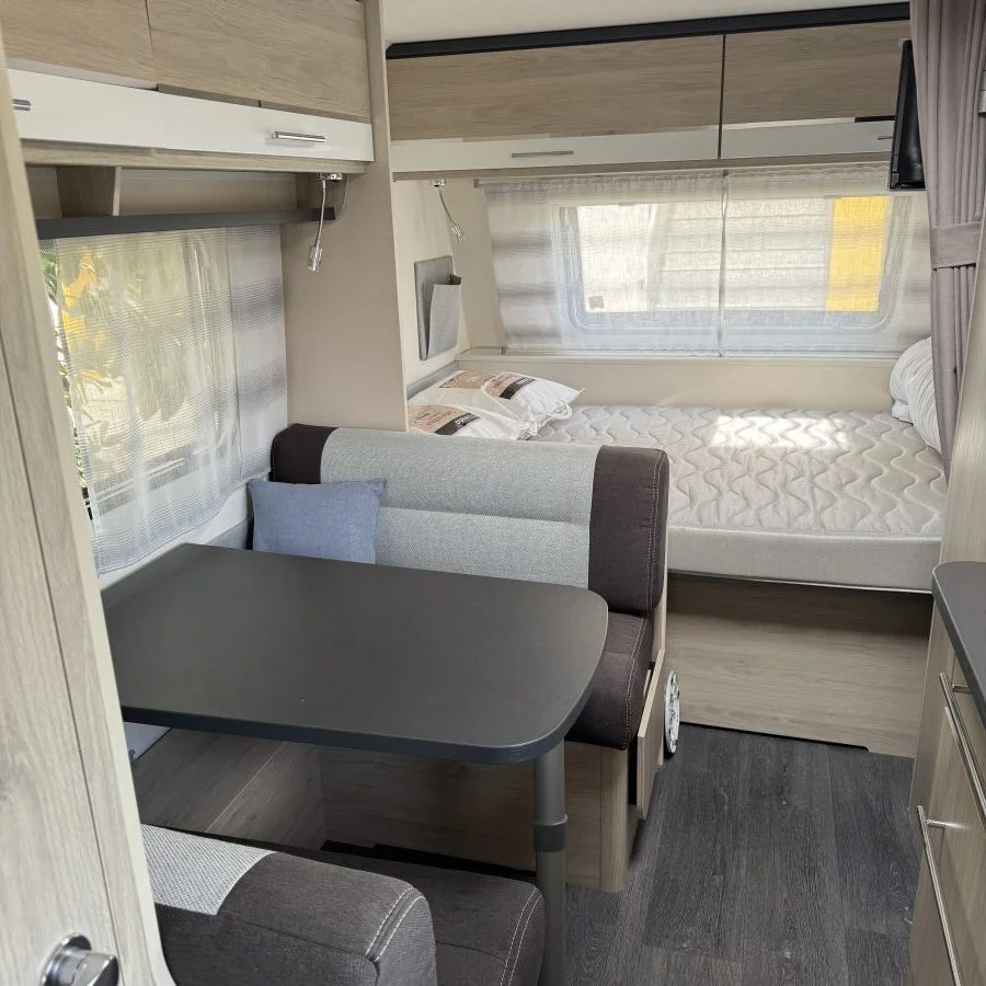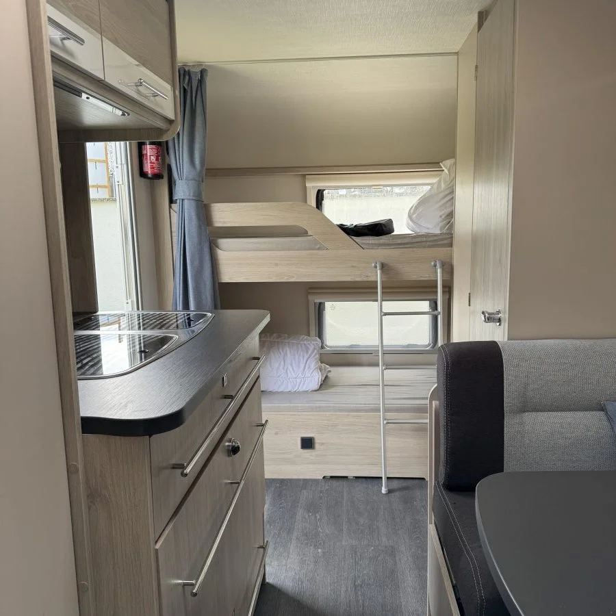 Caravane Caravelair Antares 2020 très peu utilisé, état indiqué quasi neuf, simple essieu. Agencement familial: grand lit 2 adultes, deux lits adultes superposés et un lit 2 enfants; dinette équipée et rangements.