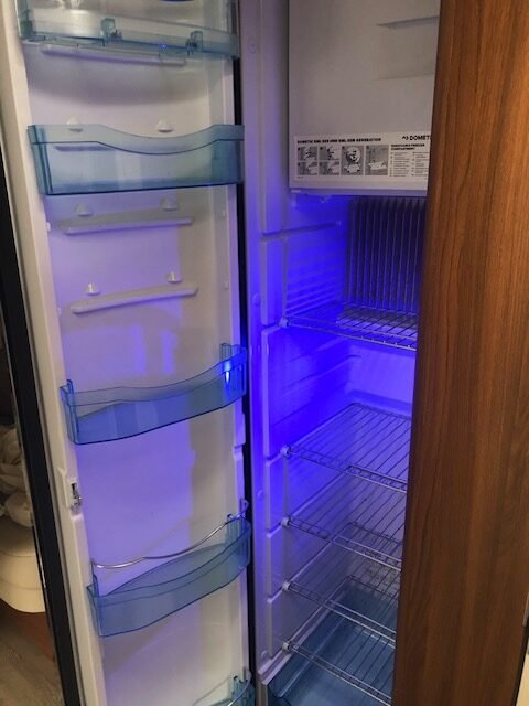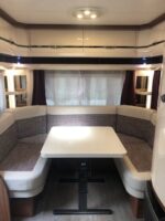 Caravane Hobby 540 UFF 2019, simple essieu, état indiqué comme neuf. Agencement avec éclairage central, grand réfrigérateur, chauffage air pulsé au gaz, eau chaude et toilettes pour un confort de voyage en toute saison.